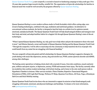 Quasar Quantum Youth Fund invites those who are interested to support its mission to heal disadvantaged youth struggling with mental, emotional, and physical challenges and hardships. To donate or for more information, visit quasarquantumyouthfund.org.